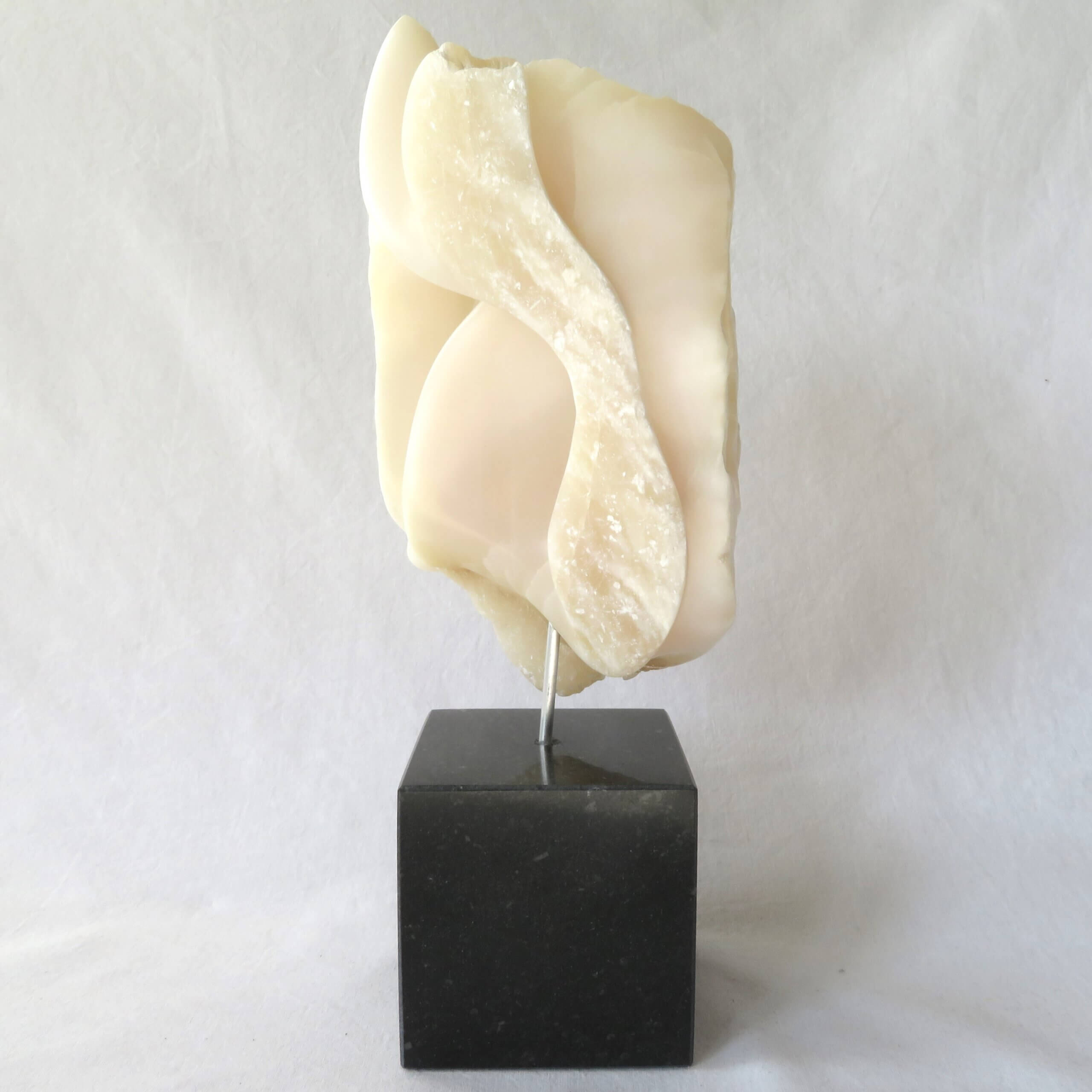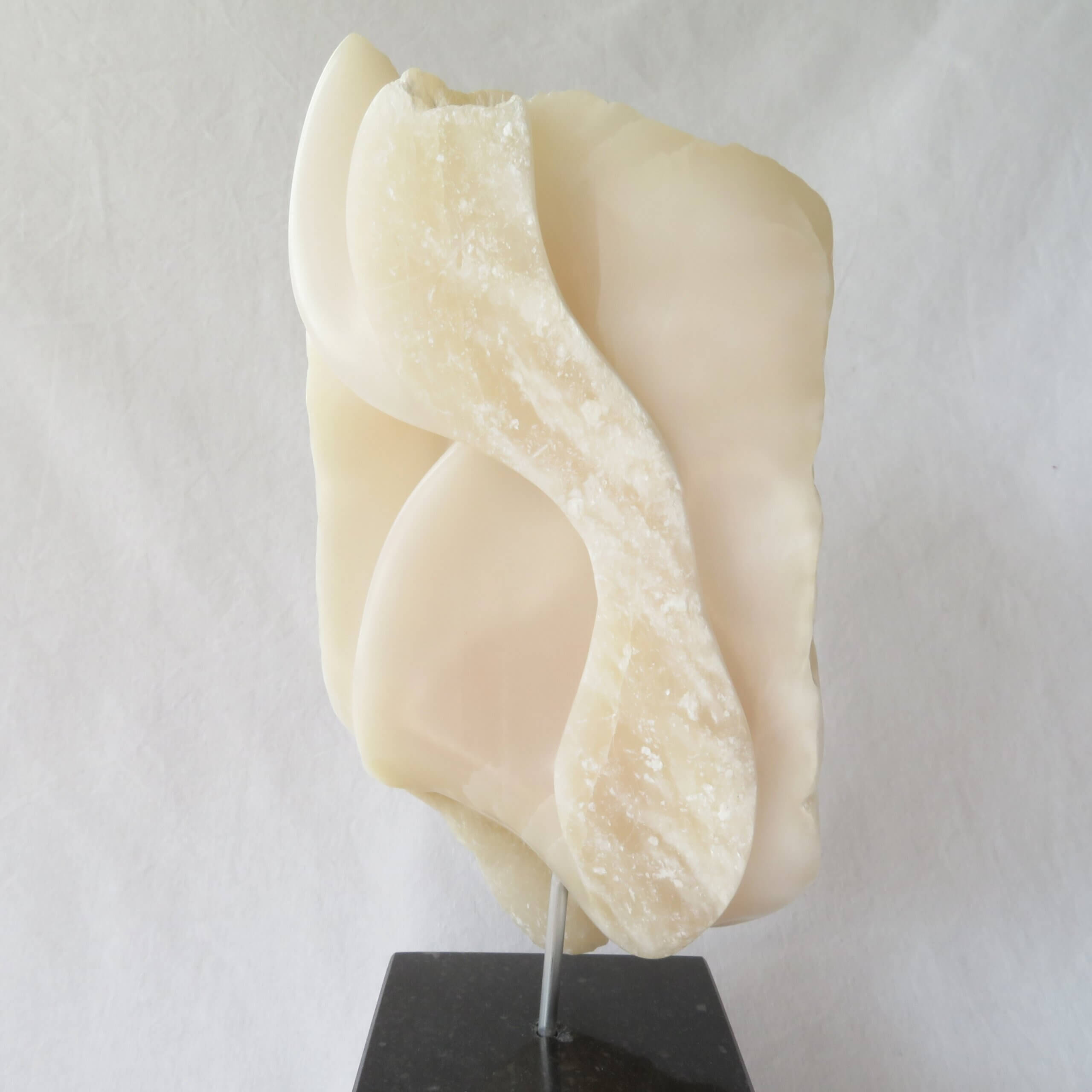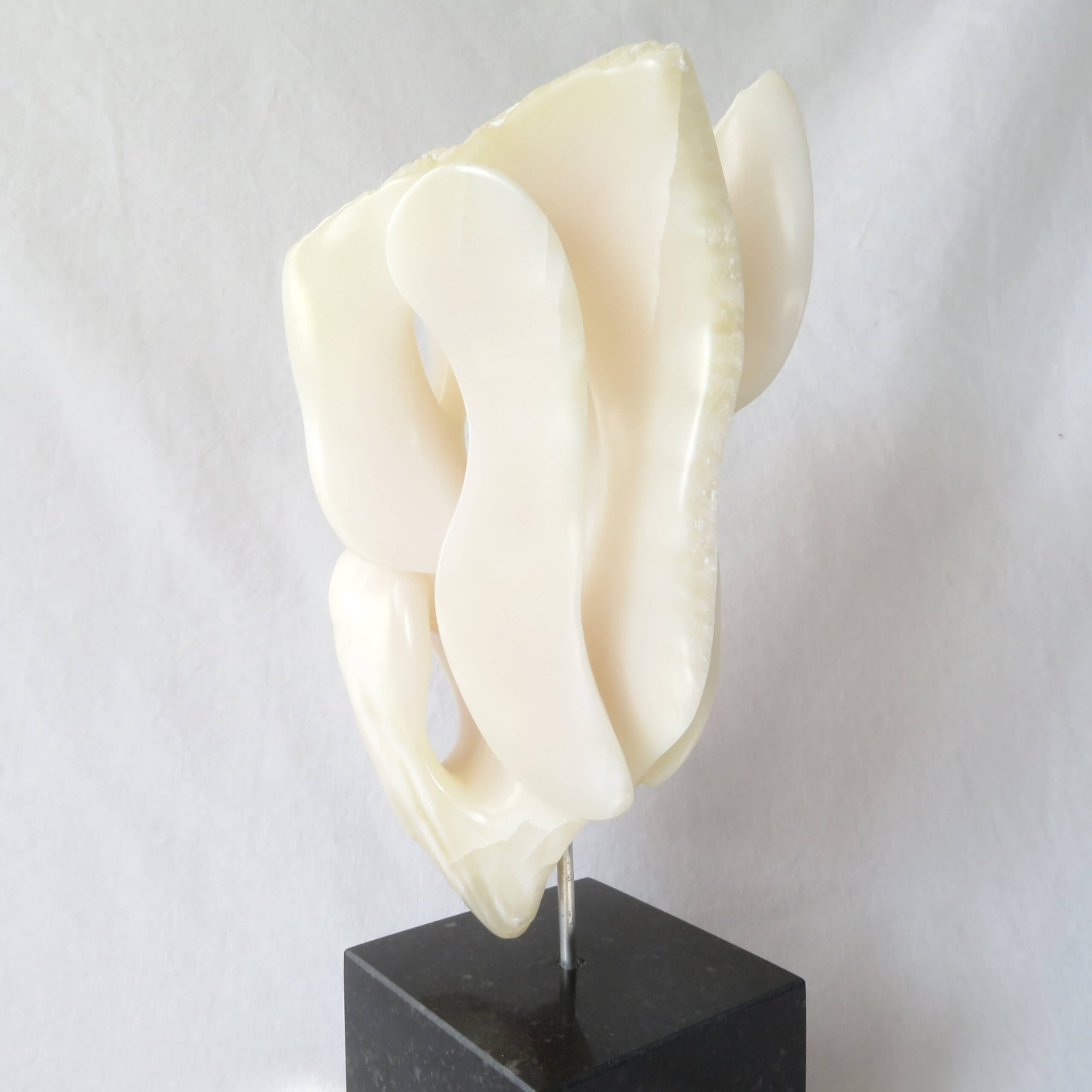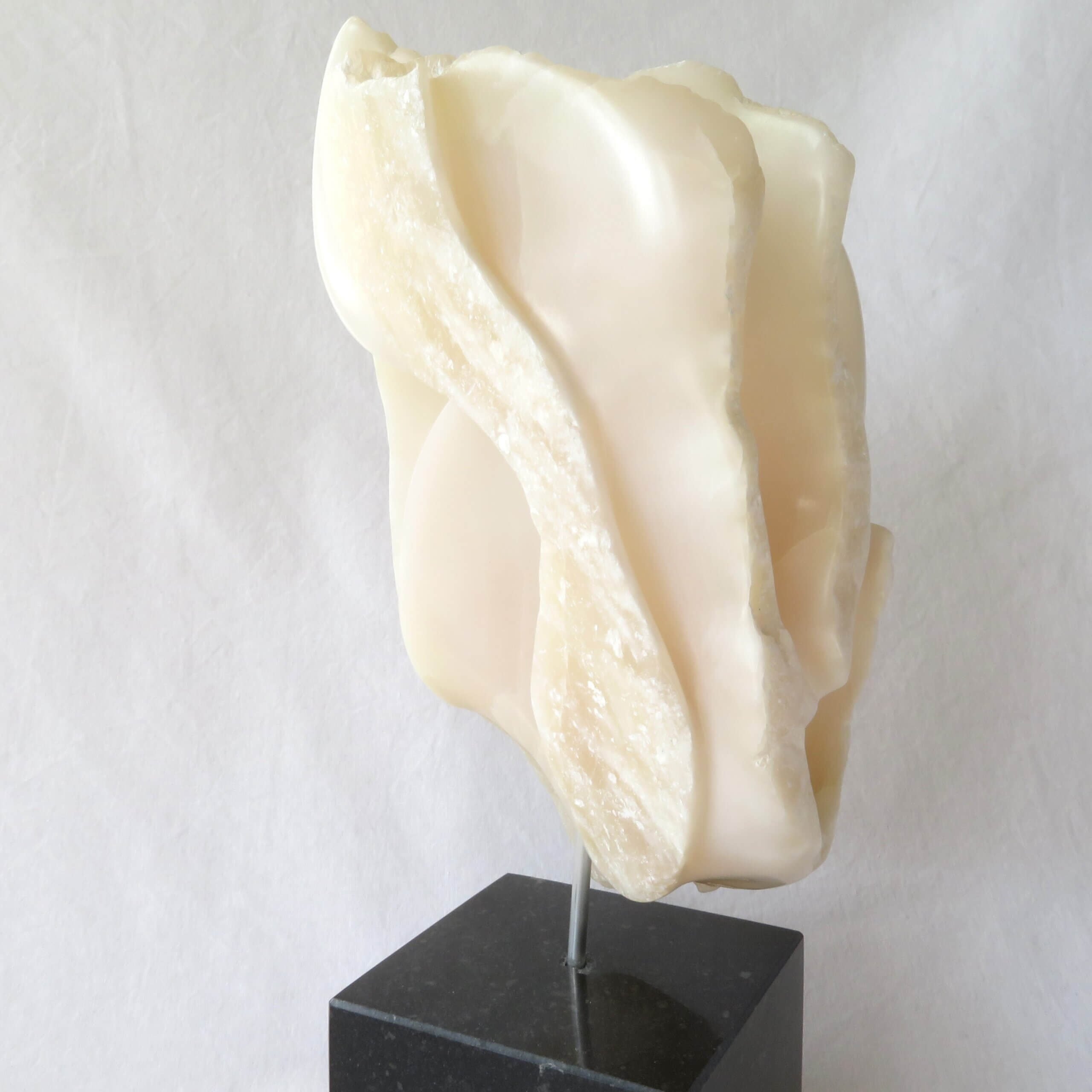 Het beeld “Het gelaagde doolhof” is vervaardigd uit wit-licht roze Chinees speksteen, gedeeltelijk gepolijst en op een zwarte hardstenen sokkel geplaatst. De sokkel heeft een zacht vilt aan de onderkant.