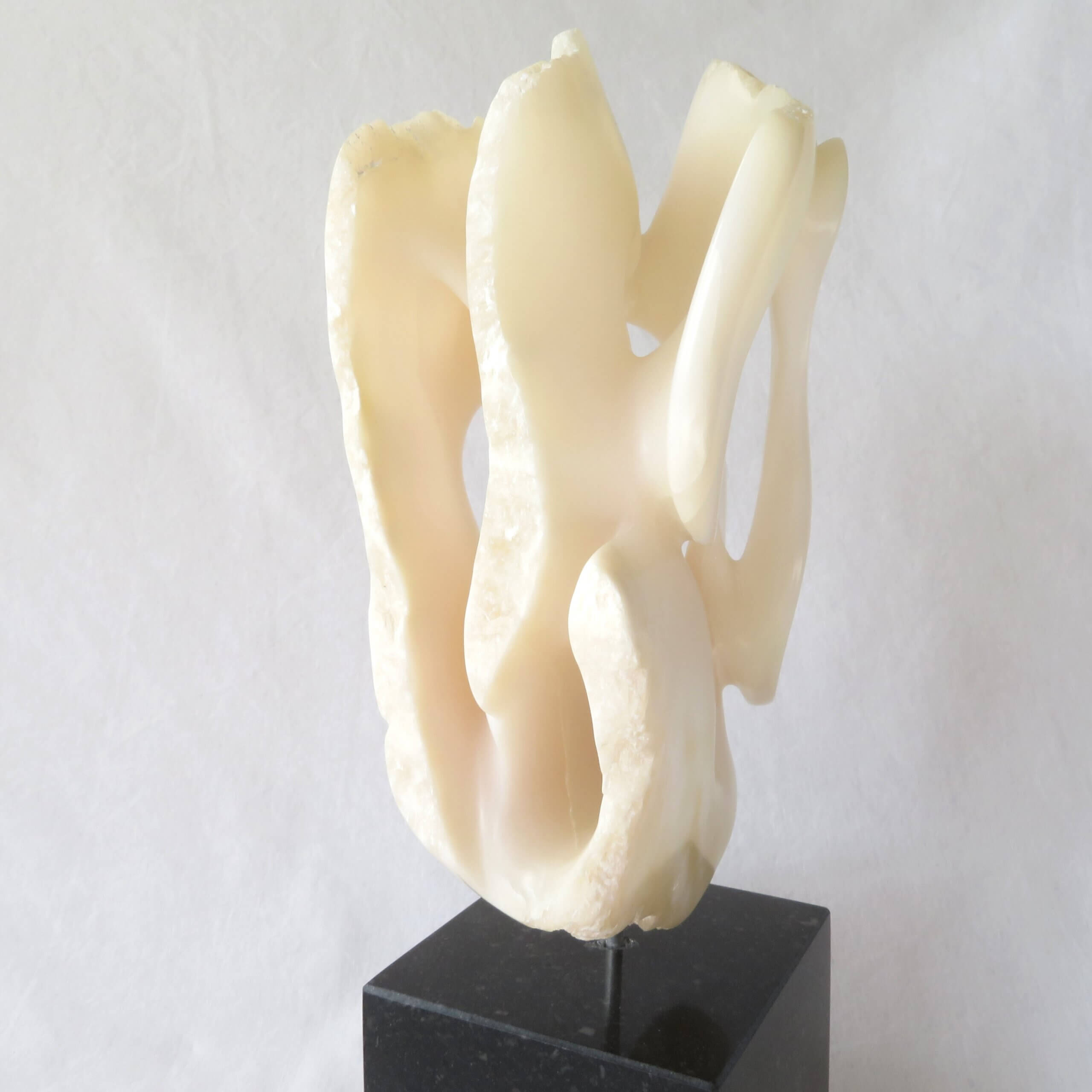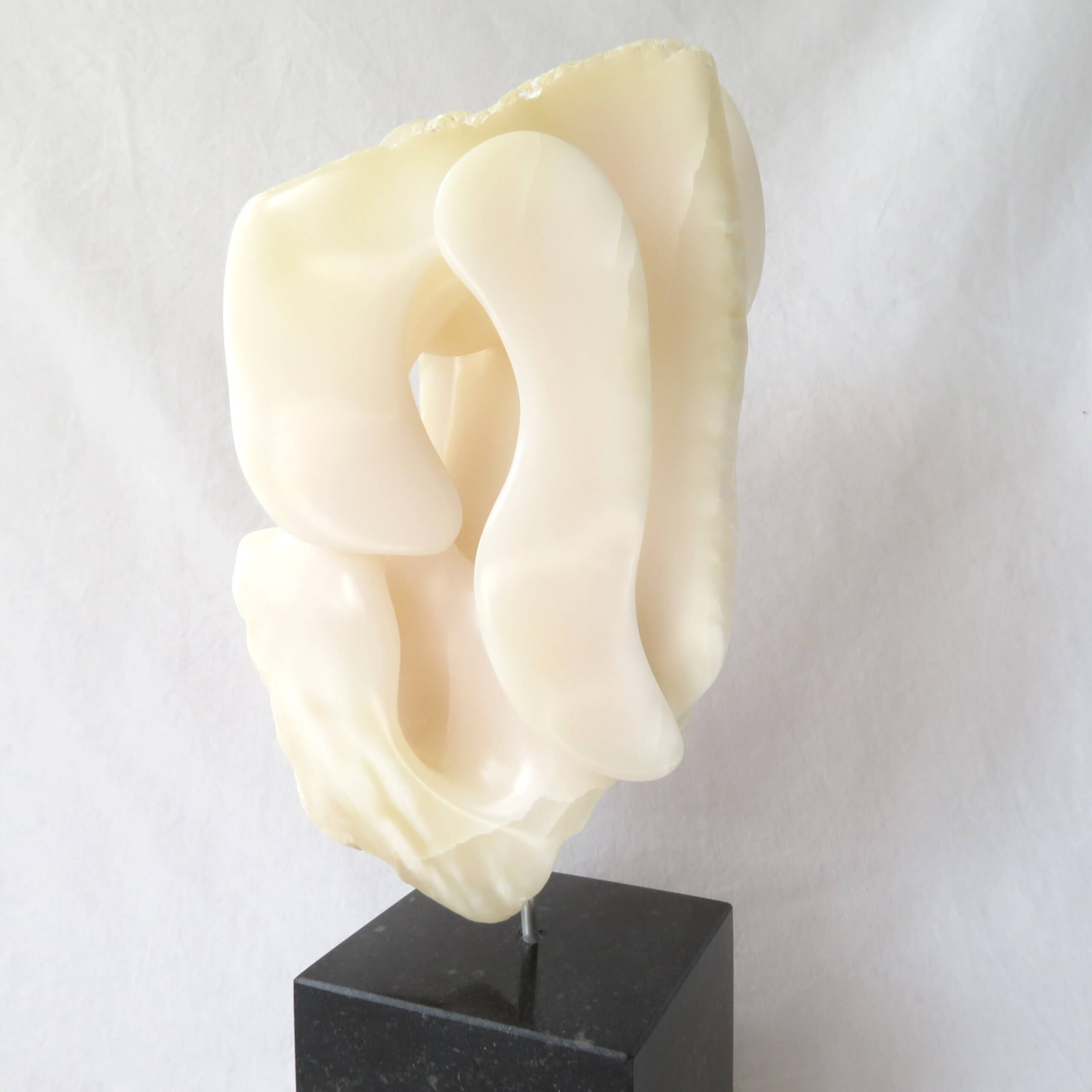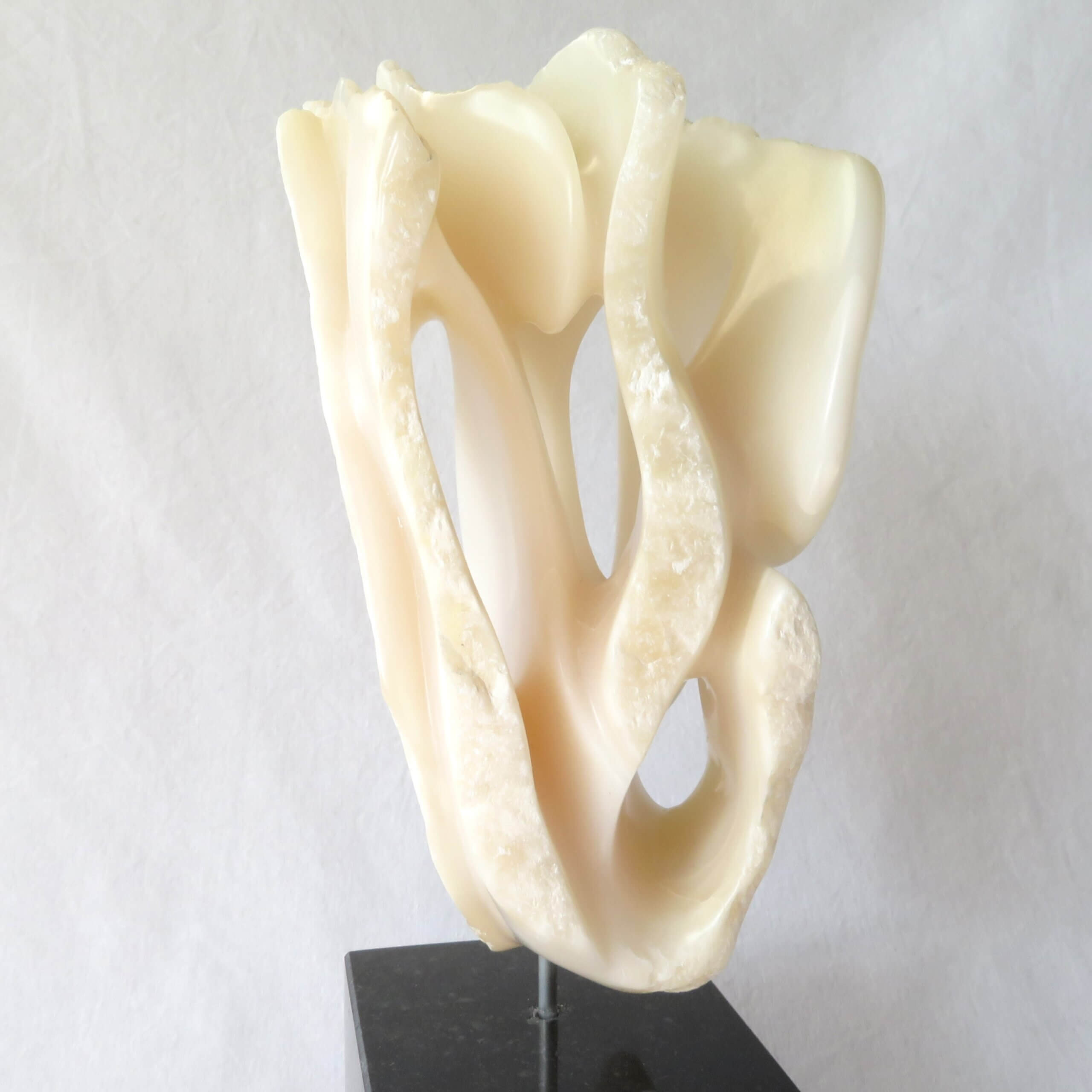 Het beeld “Het gelaagde doolhof” is vervaardigd uit wit-licht roze Chinees speksteen, gedeeltelijk gepolijst en op een zwarte hardstenen sokkel geplaatst. De sokkel heeft een zacht vilt aan de onderkant.