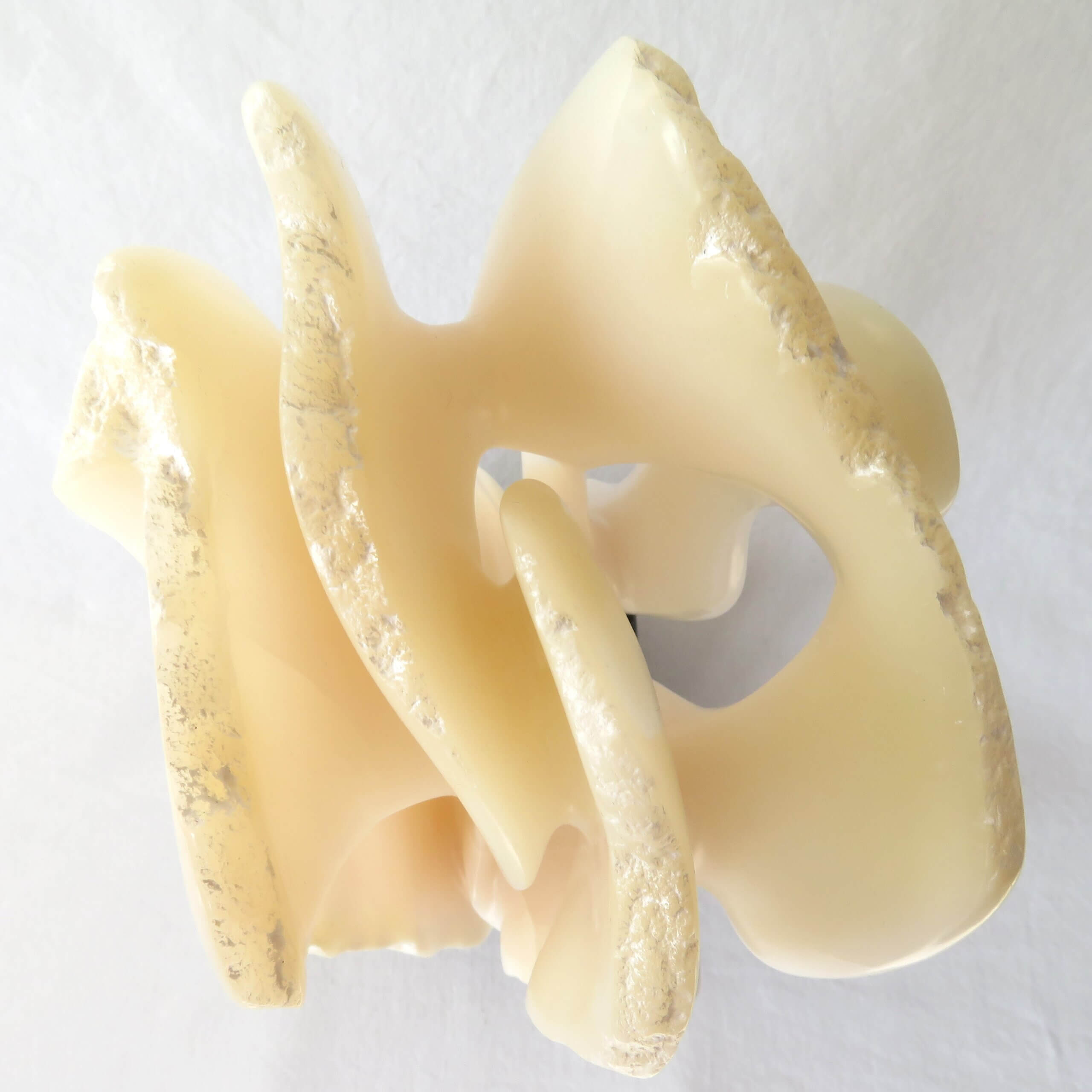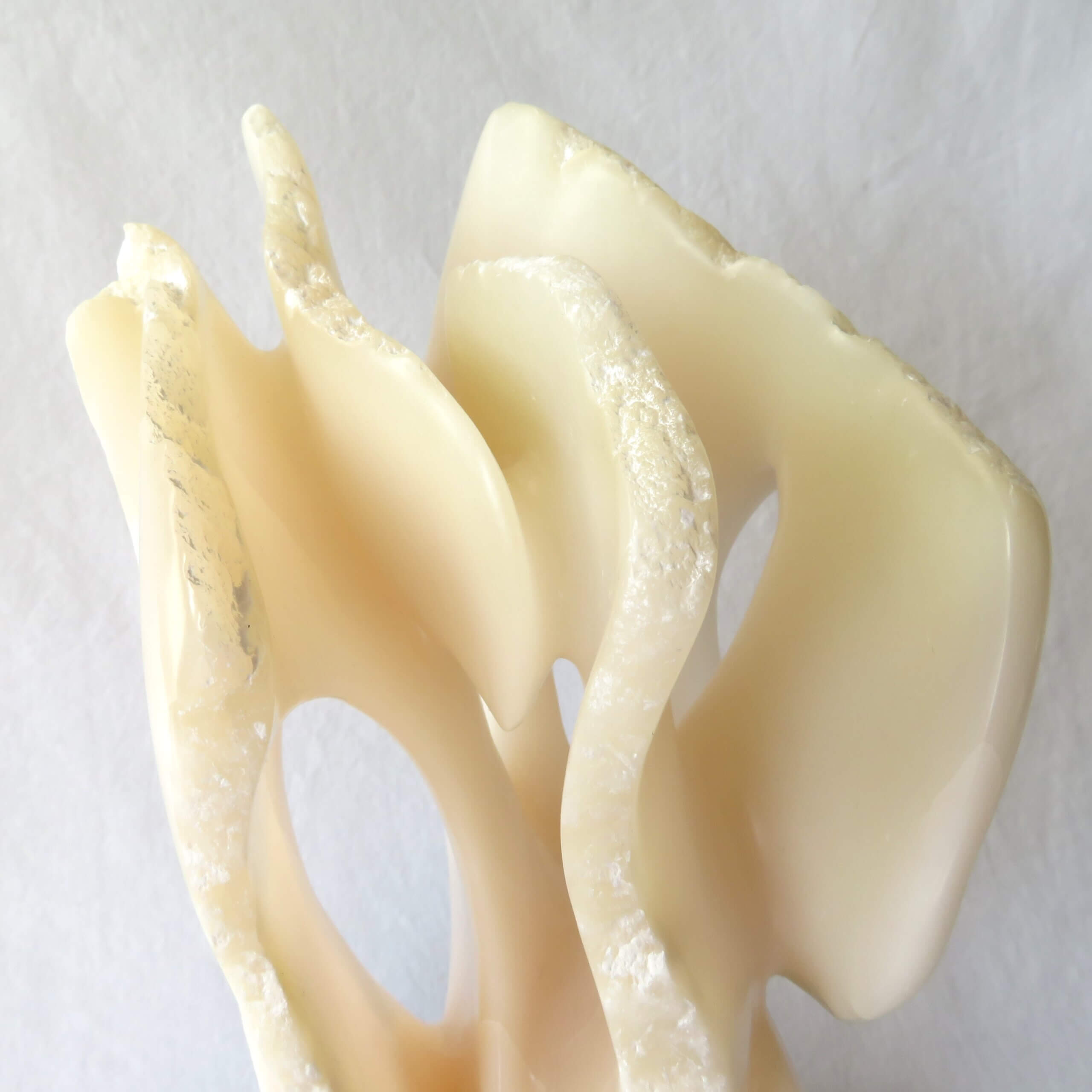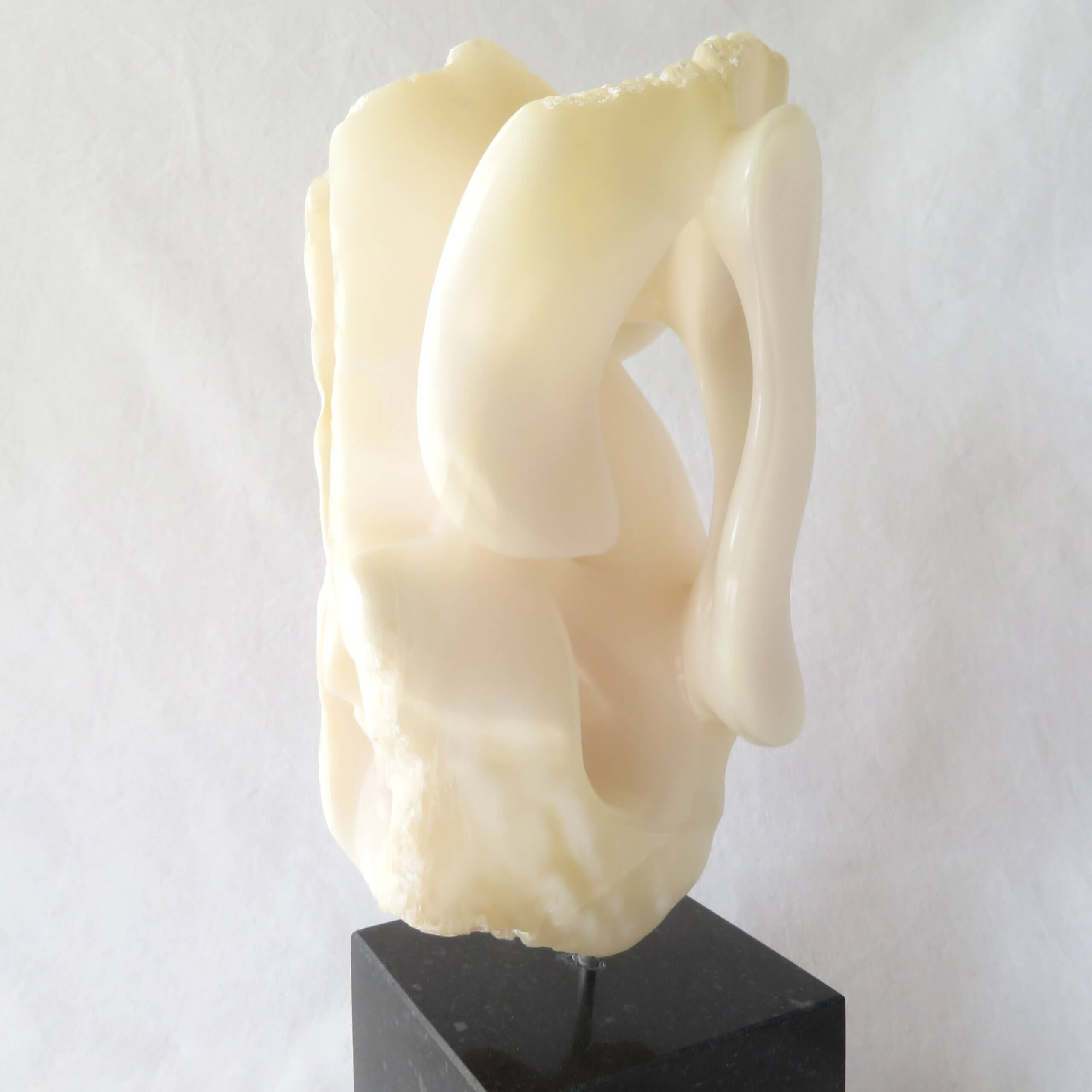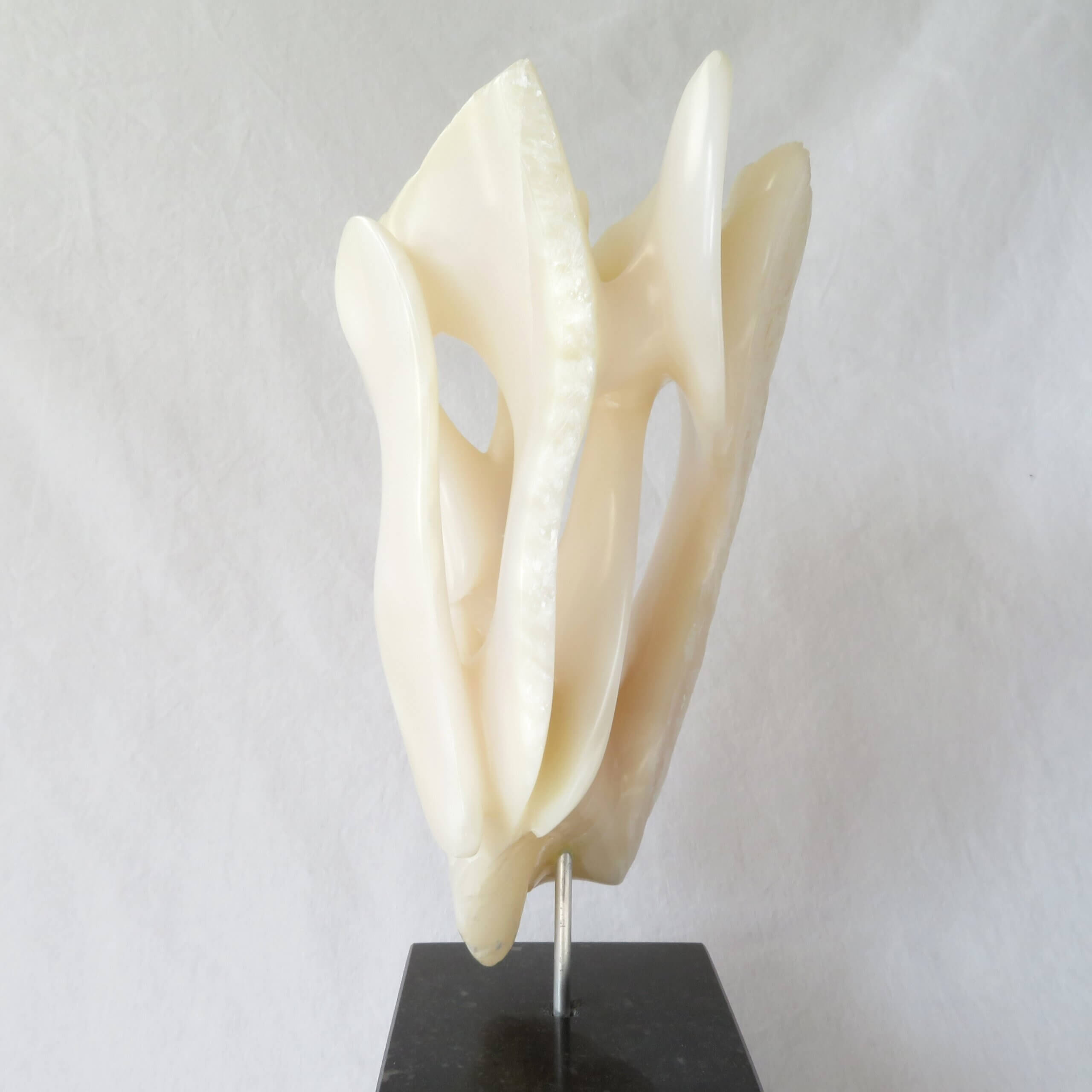Het beeld “Het gelaagde doolhof” is vervaardigd uit wit-licht roze Chinees speksteen, gedeeltelijk gepolijst en op een zwarte hardstenen sokkel geplaatst. De sokkel heeft een zacht vilt aan de onderkant.