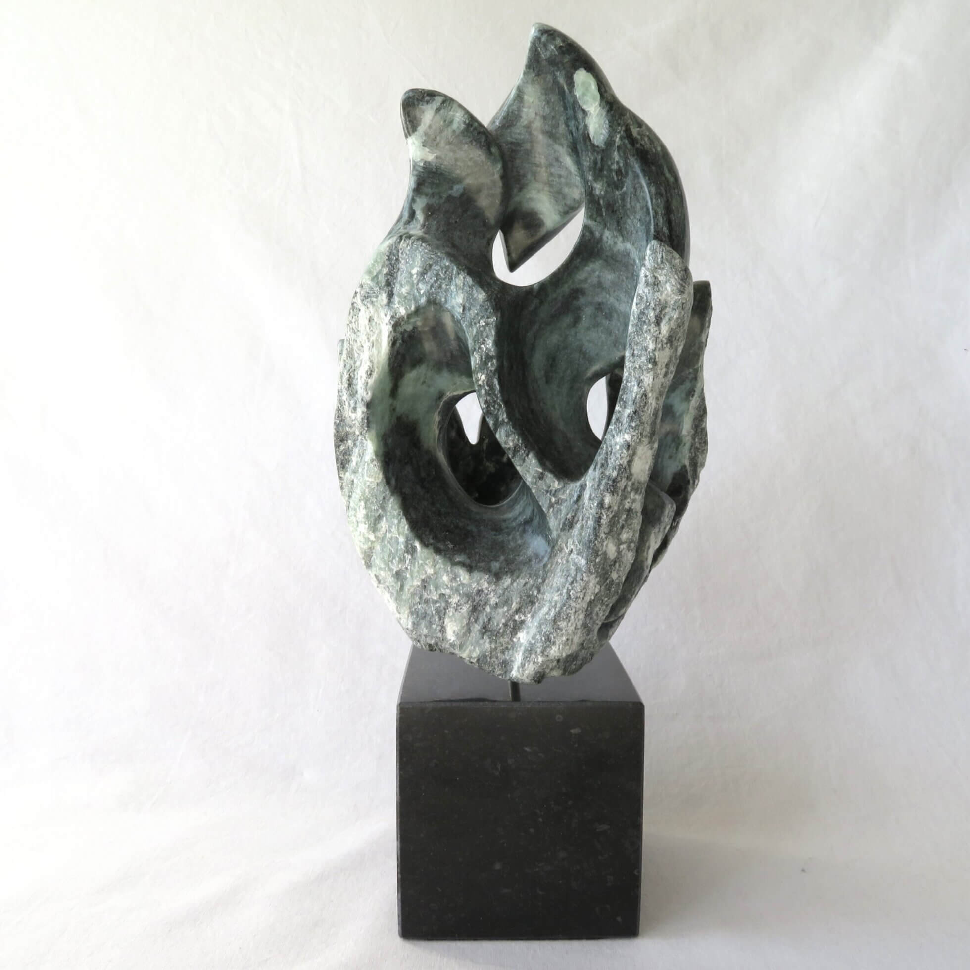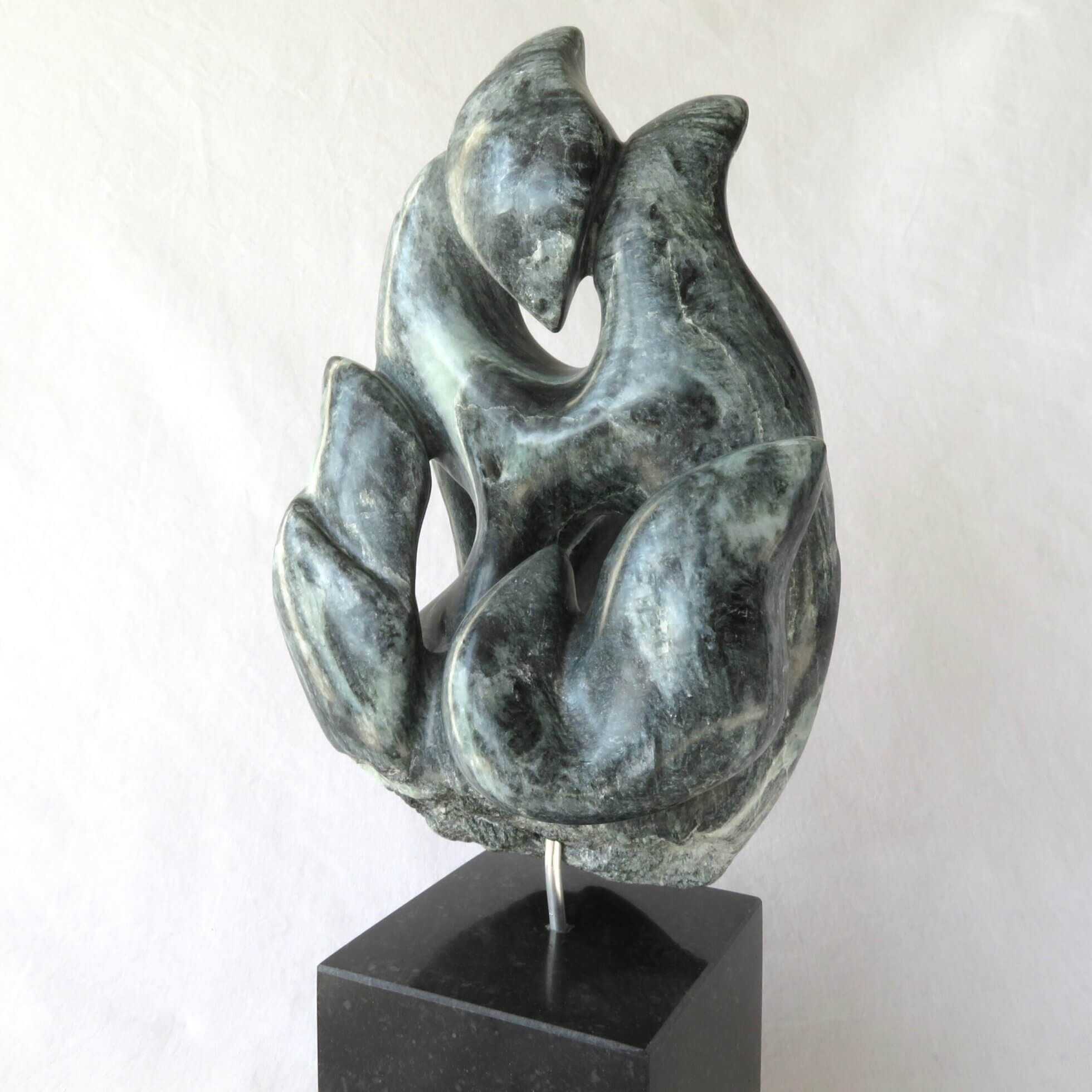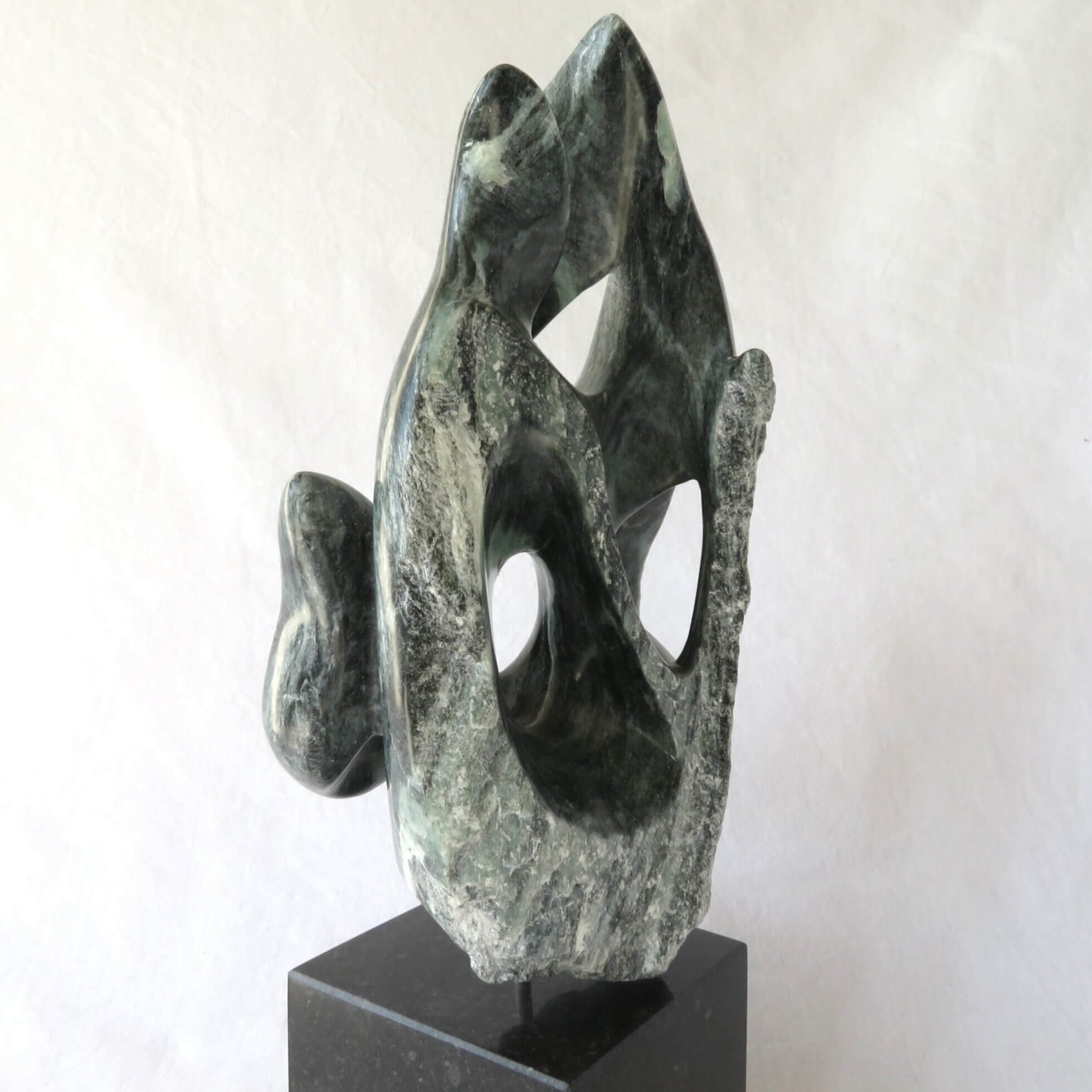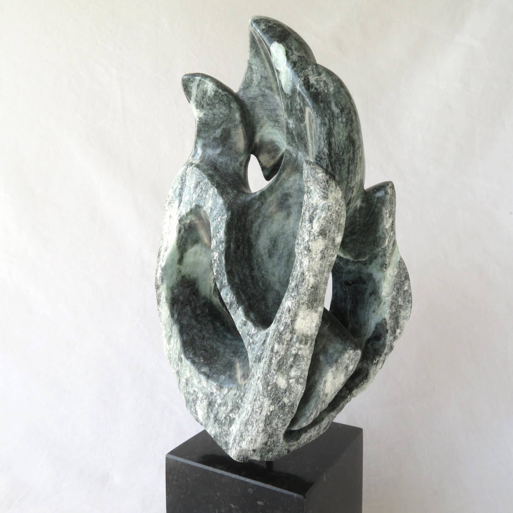 Het beeld “In vlammen” is vervaardigd uit blauw/groen Braziliaans speksteen, gedeeltelijk gepolijst en op een zwarte hardstenen sokkel geplaatst. De sokkel heeft een zacht vilt aan de onderkant.
