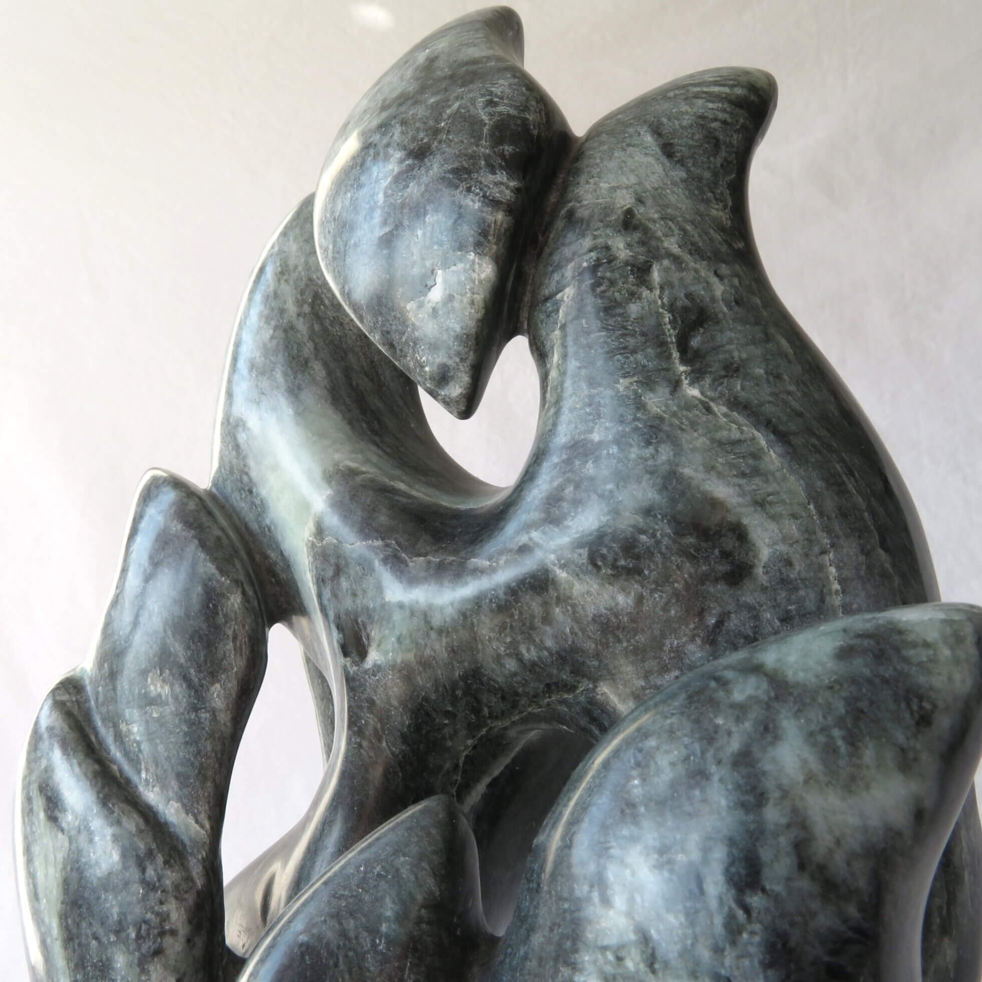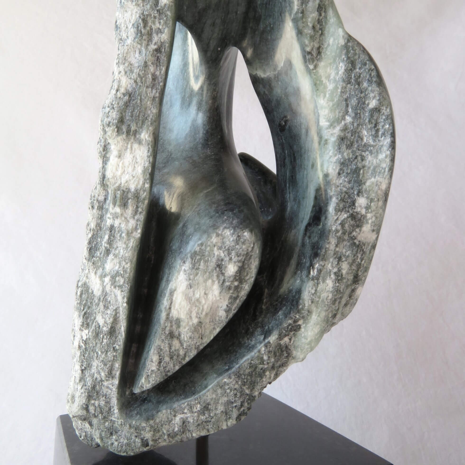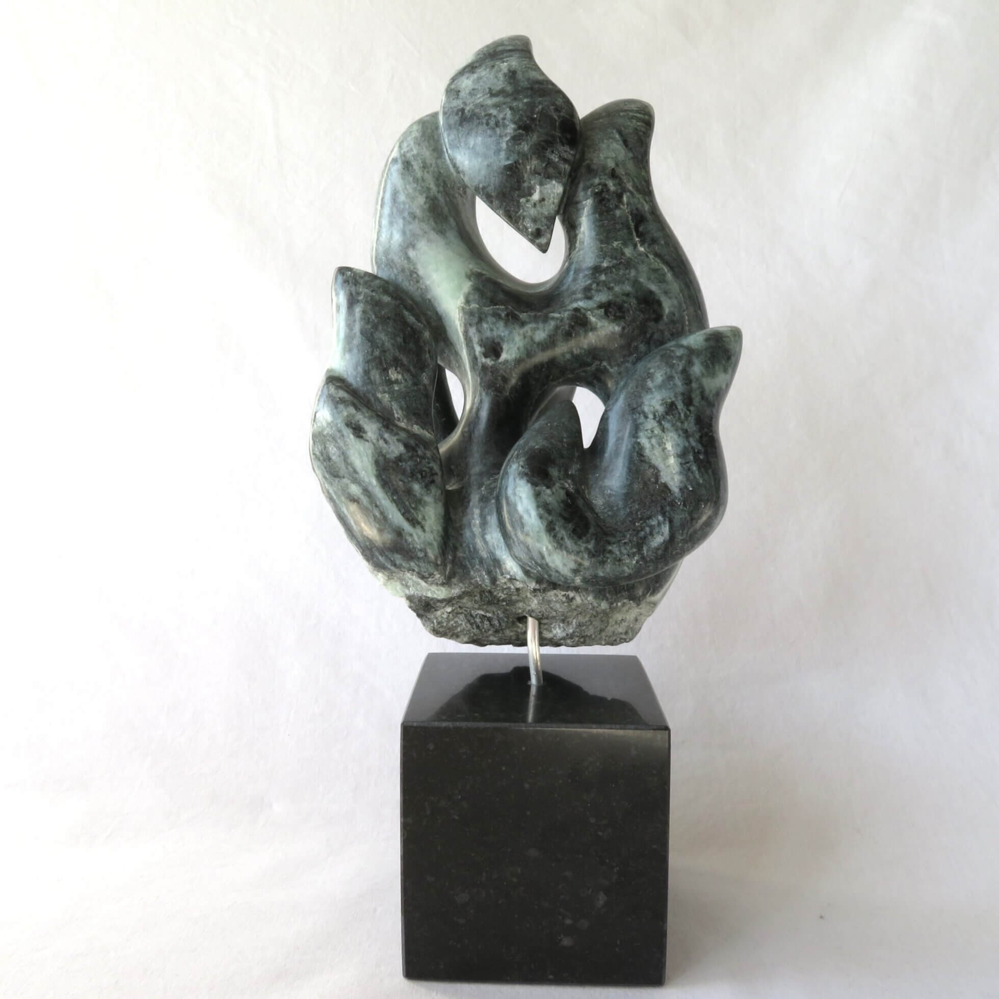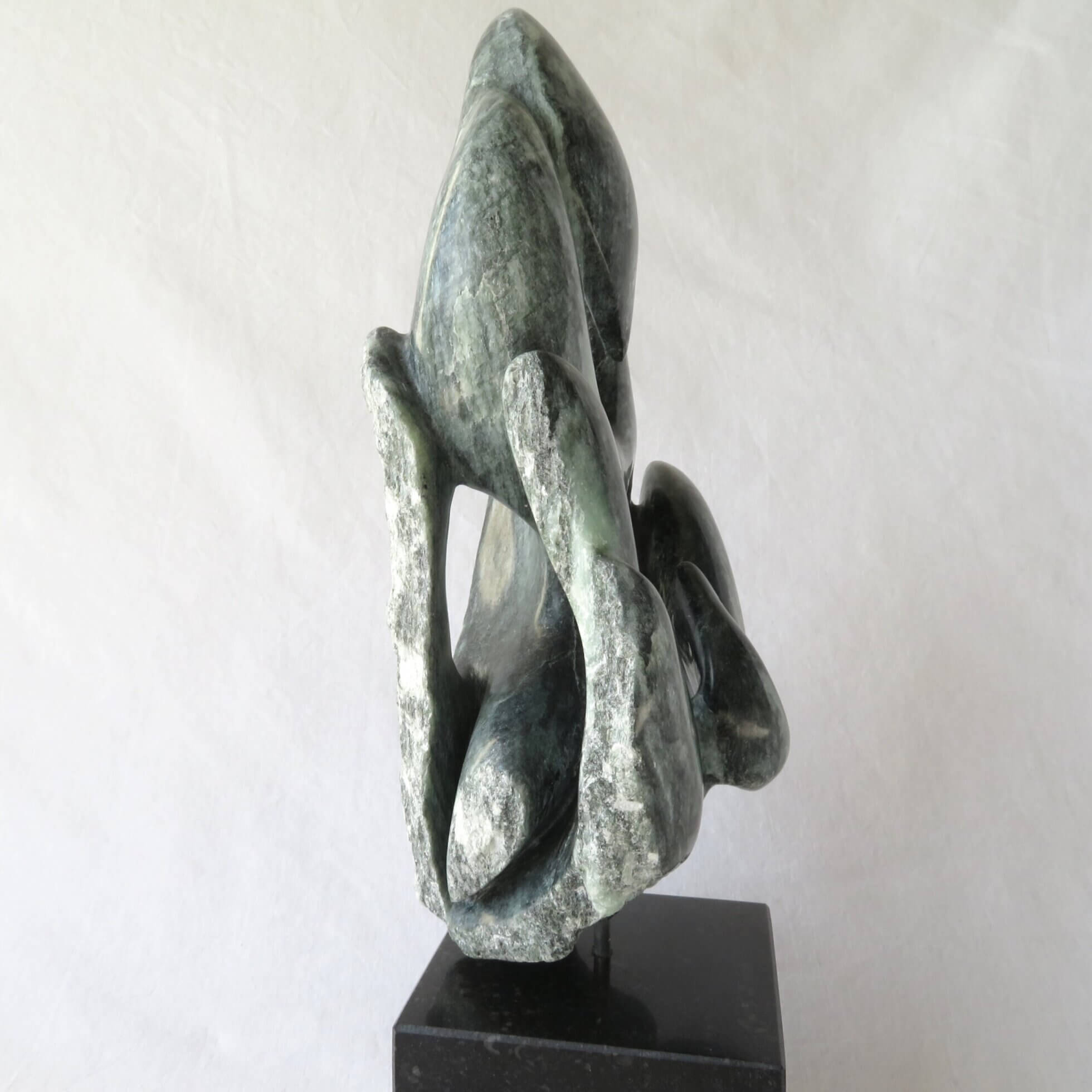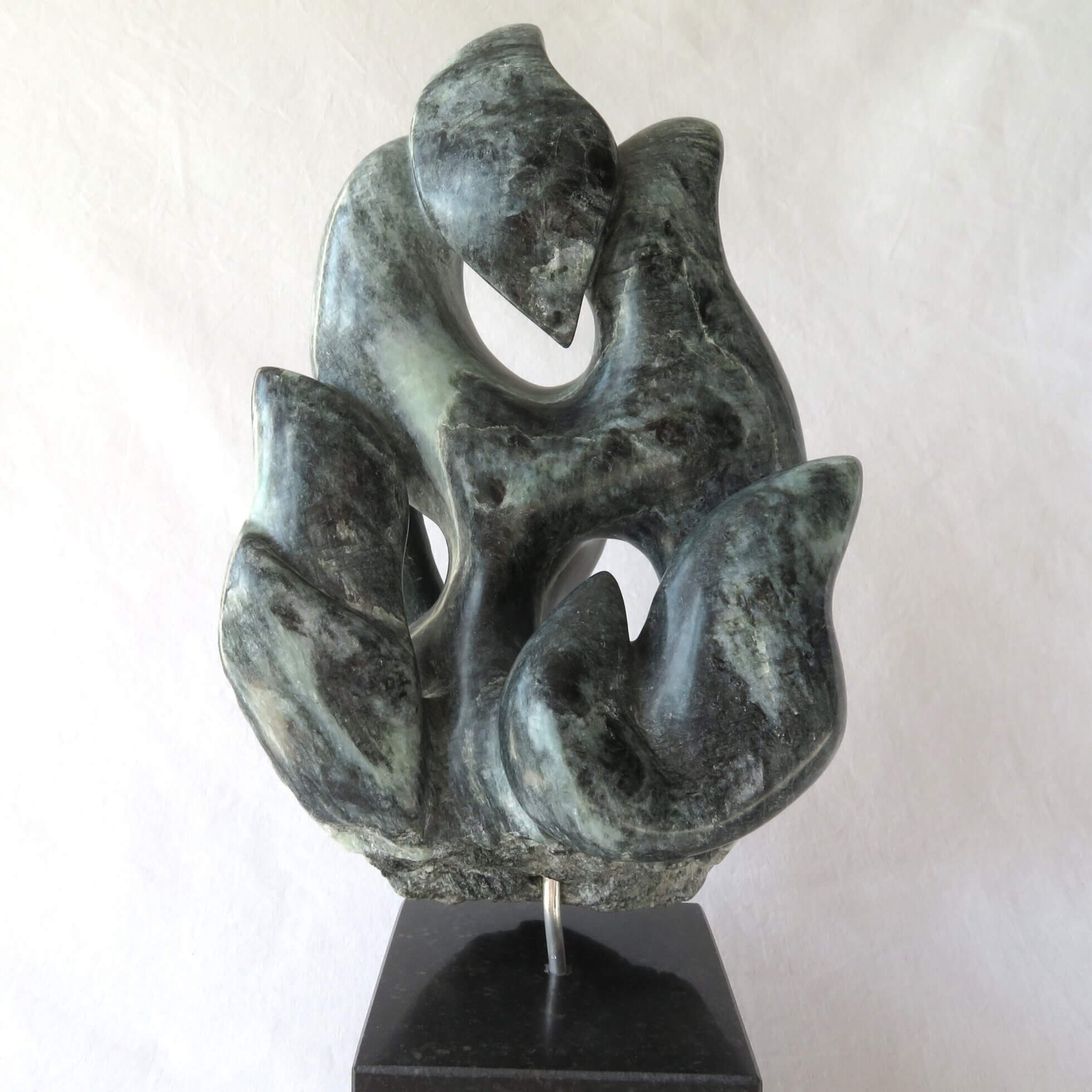 Het beeld “In vlammen” is vervaardigd uit blauw/groen Braziliaans speksteen, gedeeltelijk gepolijst en op een zwarte hardstenen sokkel geplaatst. De sokkel heeft een zacht vilt aan de onderkant.
