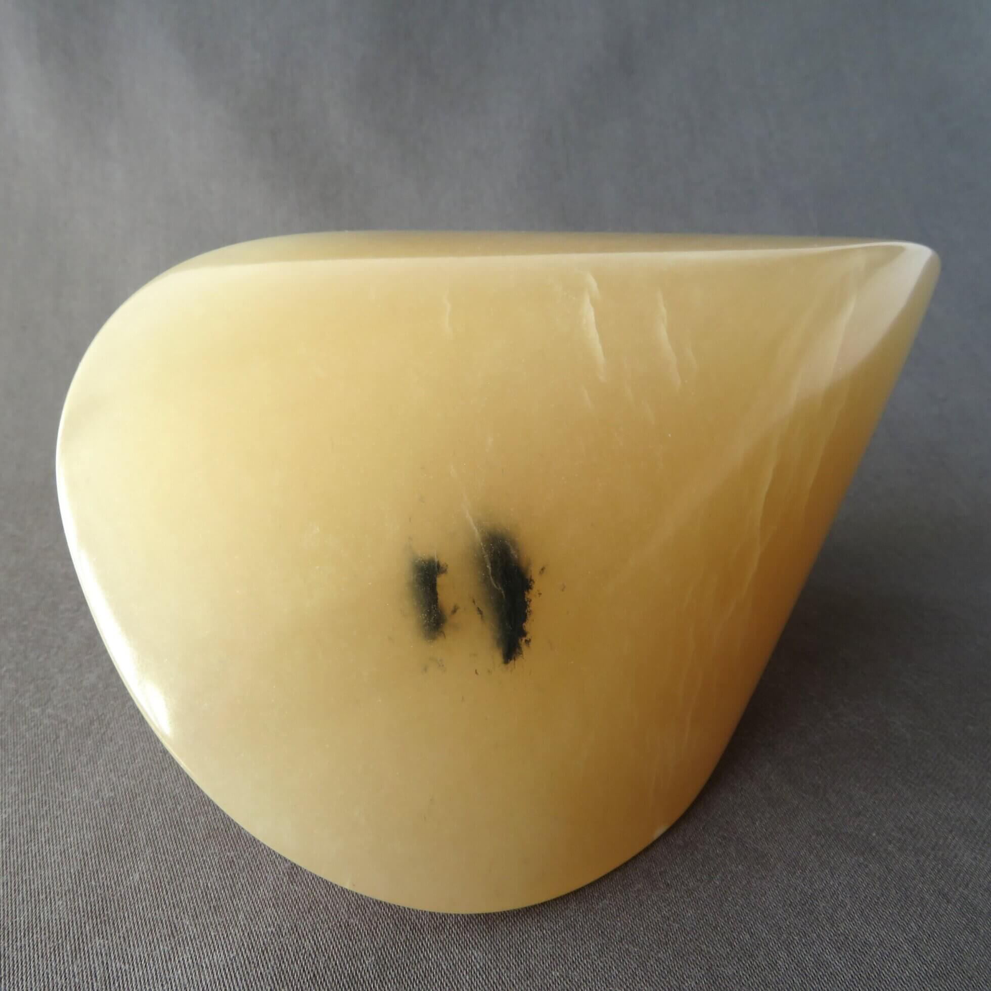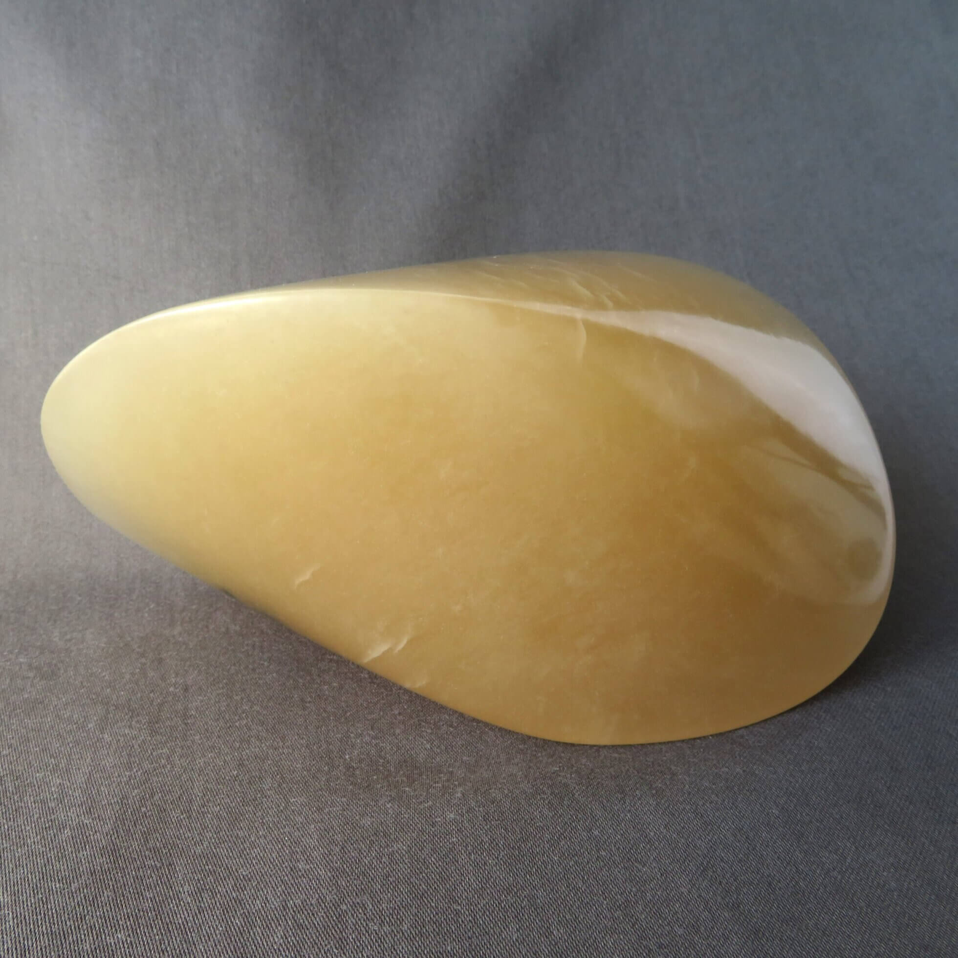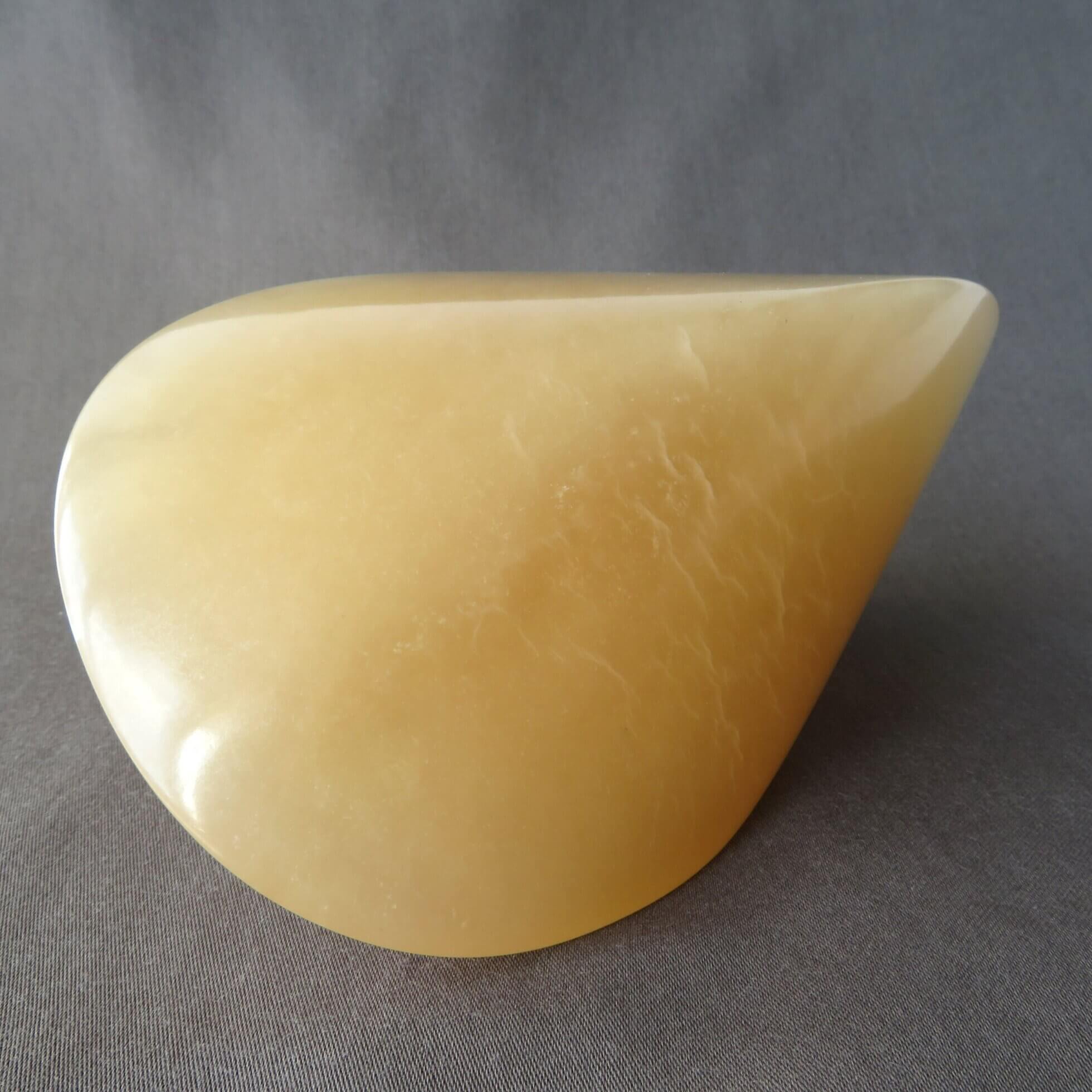 De karamel oloïde is vervaardigd uit karamel kleurig albast en is daarmee beperkt licht doorlatend. De oloïde is gepolijst en beschermt met crème wat de steen een prachtige glans.
