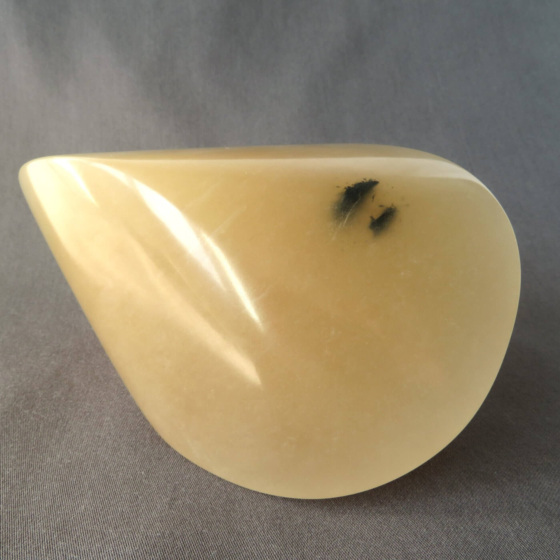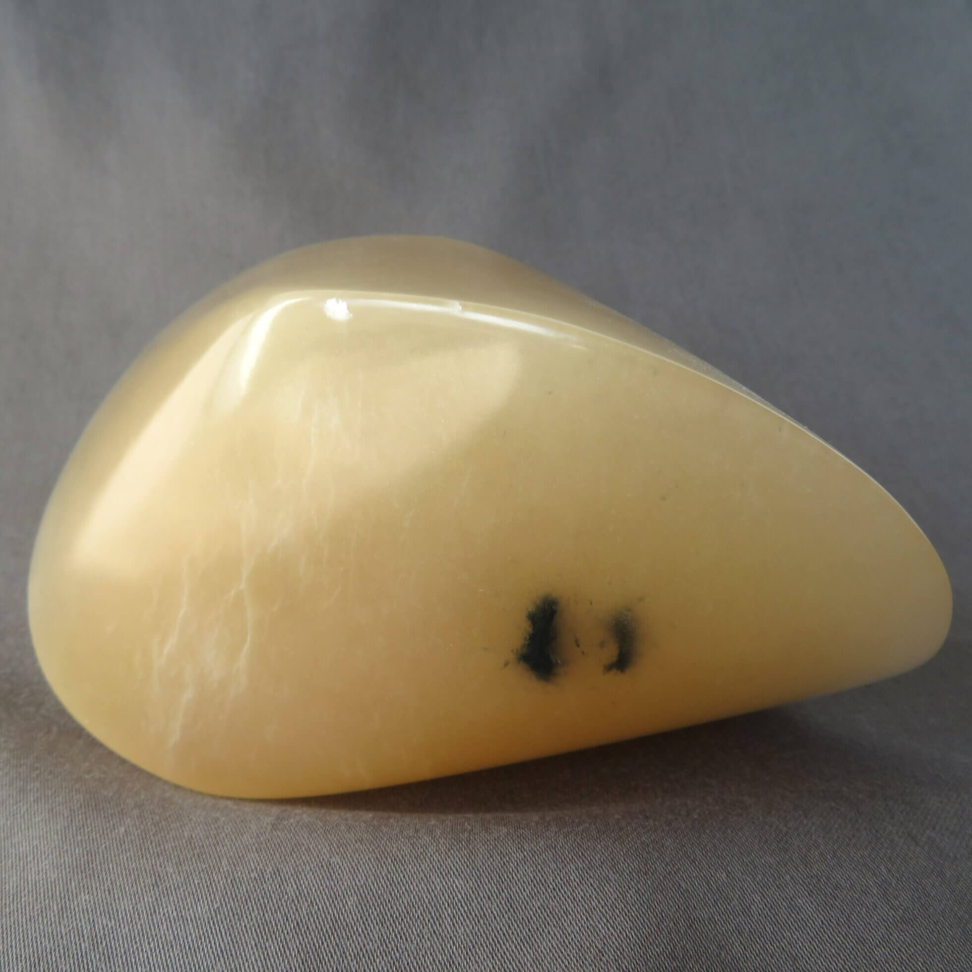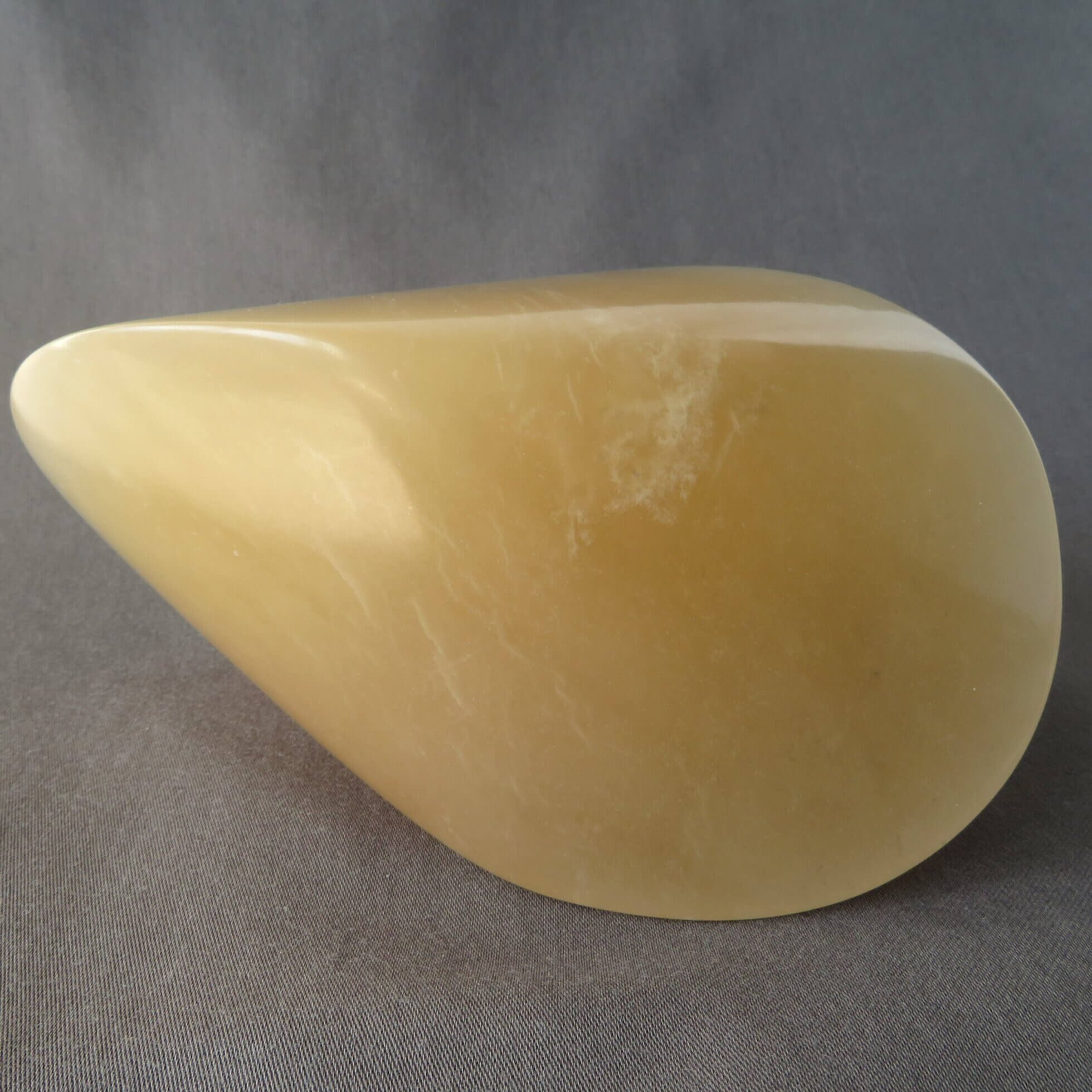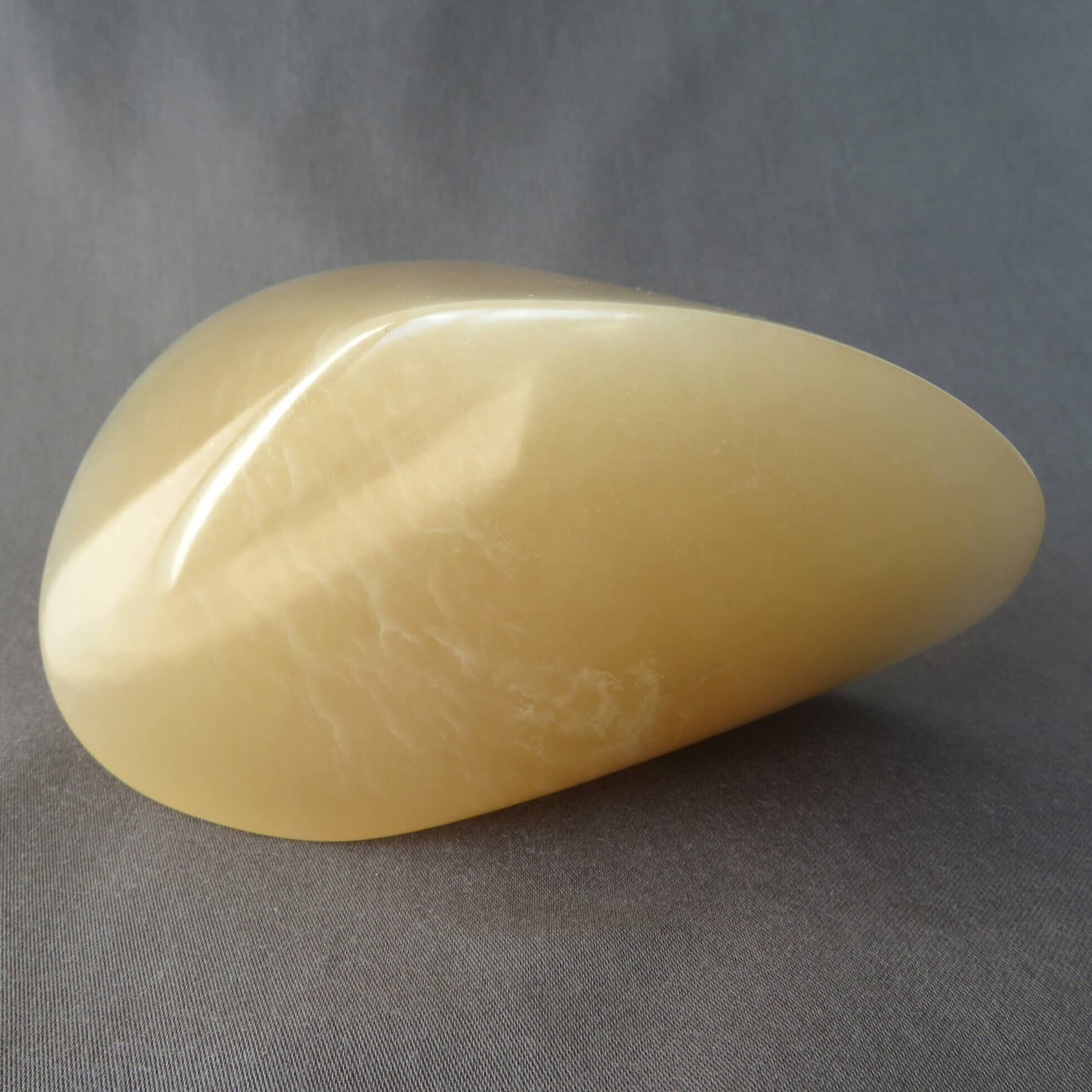 De karamel oloïde is vervaardigd uit karamel kleurig albast en is daarmee beperkt licht doorlatend. De oloïde is gepolijst en beschermt met crème wat de steen een prachtige glans.
