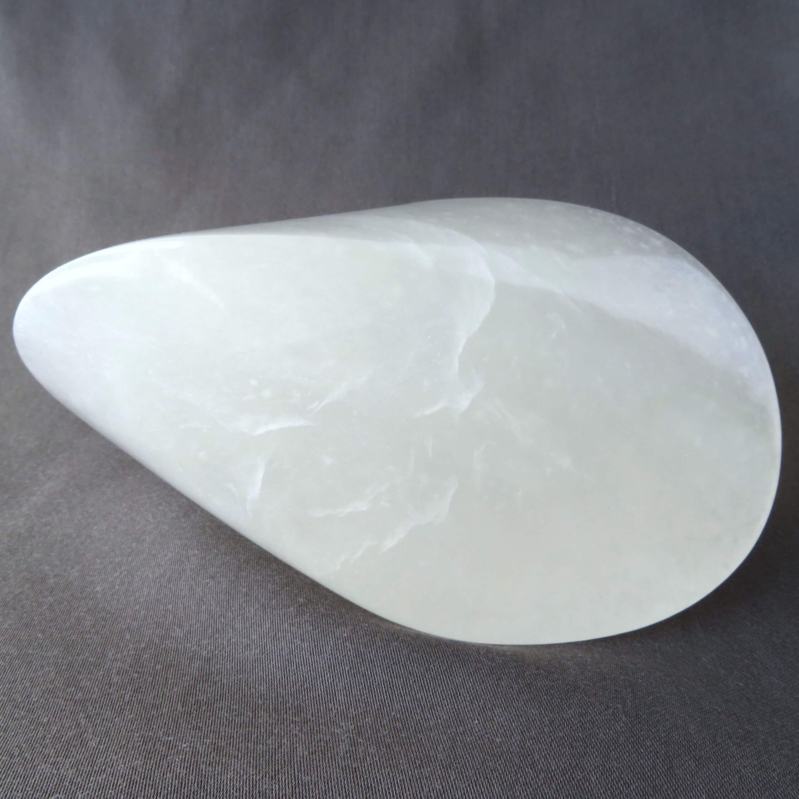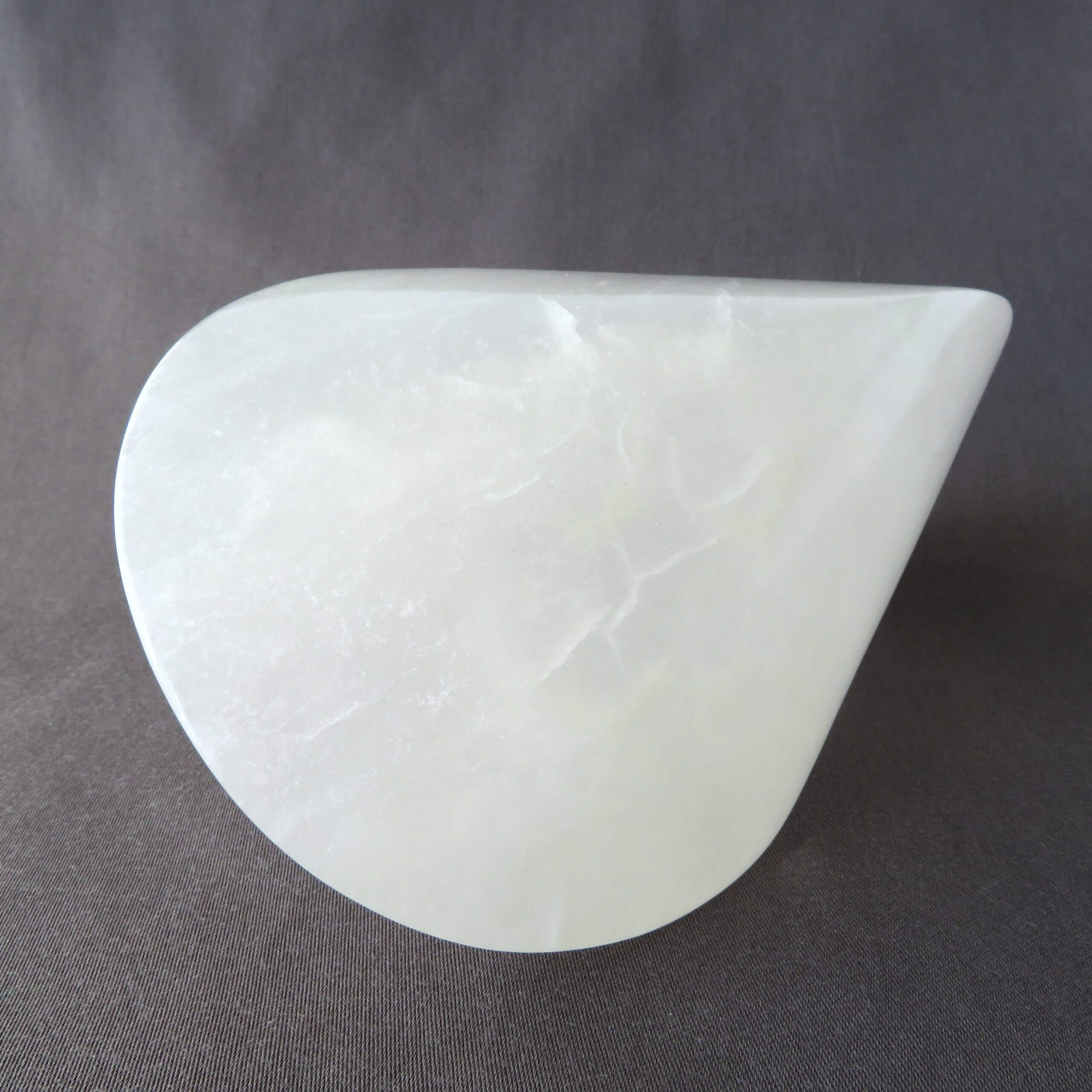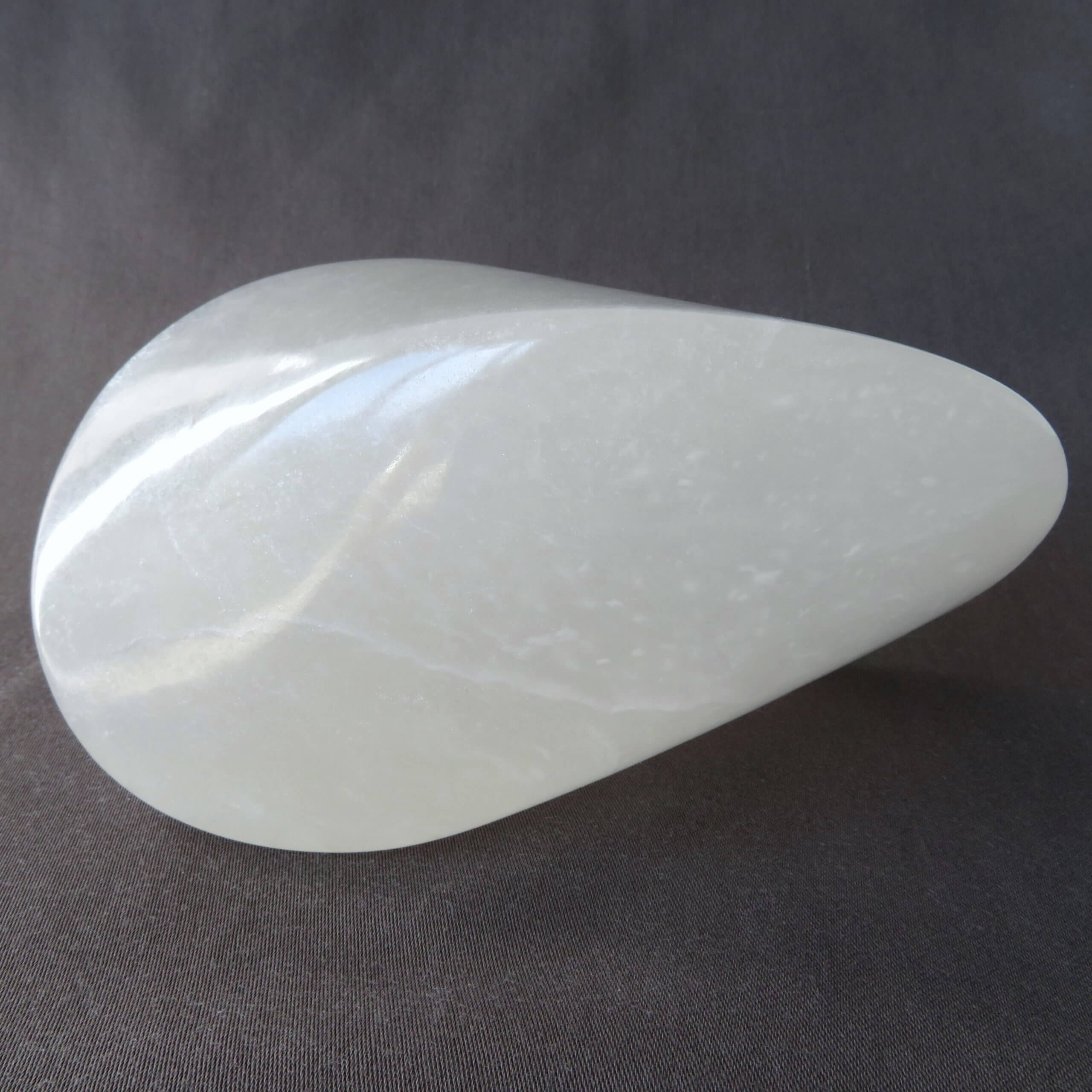 De witte oloïde is vervaardigd uit wit albast en is daarmee licht doorlatend. De oloïde is gepolijst en beschermt met een crème wat de steen een prachtige glans geeft en beschermt tegen verkleuren. Ondanks de bescherming kan albast op ten duur gaan verkleuren. Leg de oloïde dus niet in direct zonlicht.