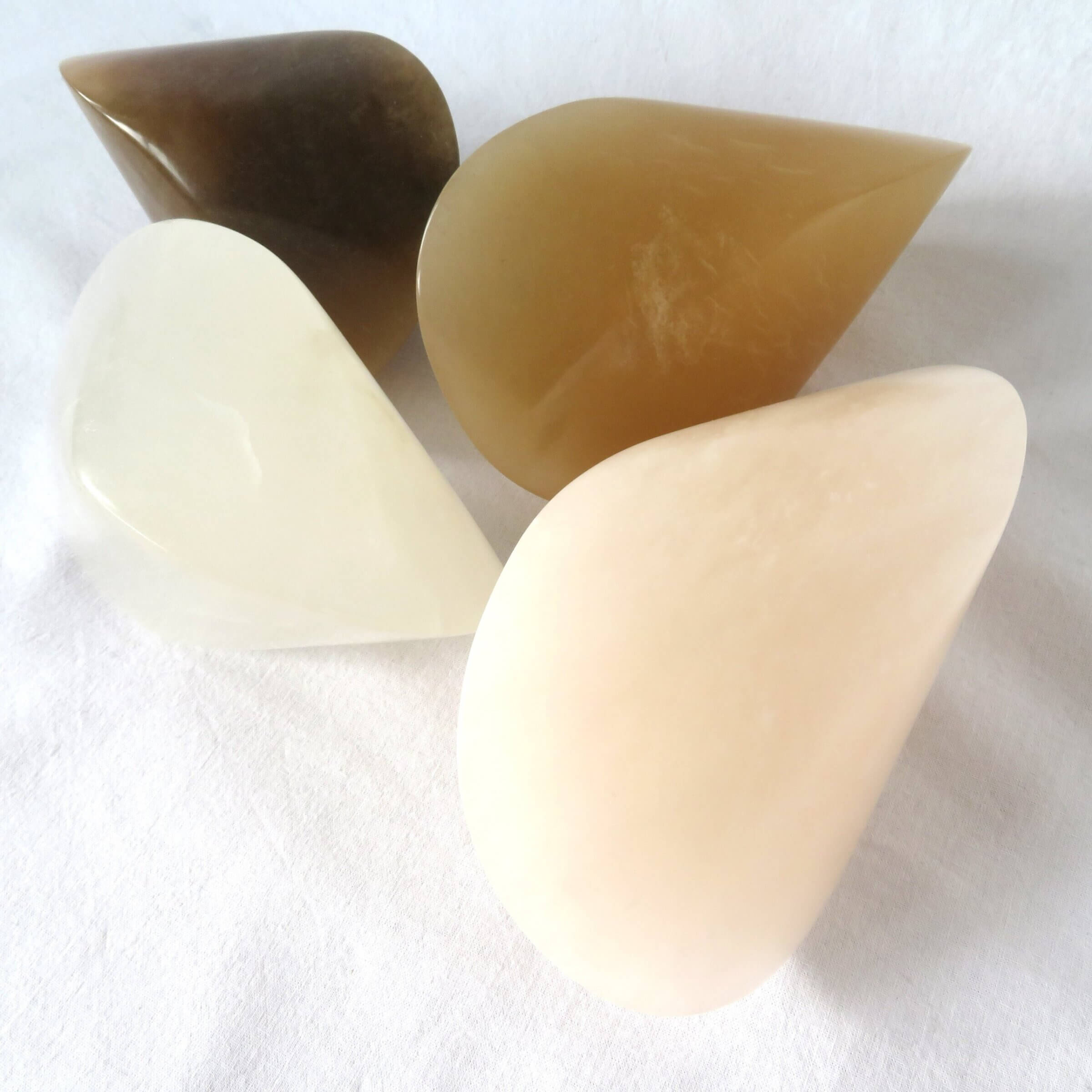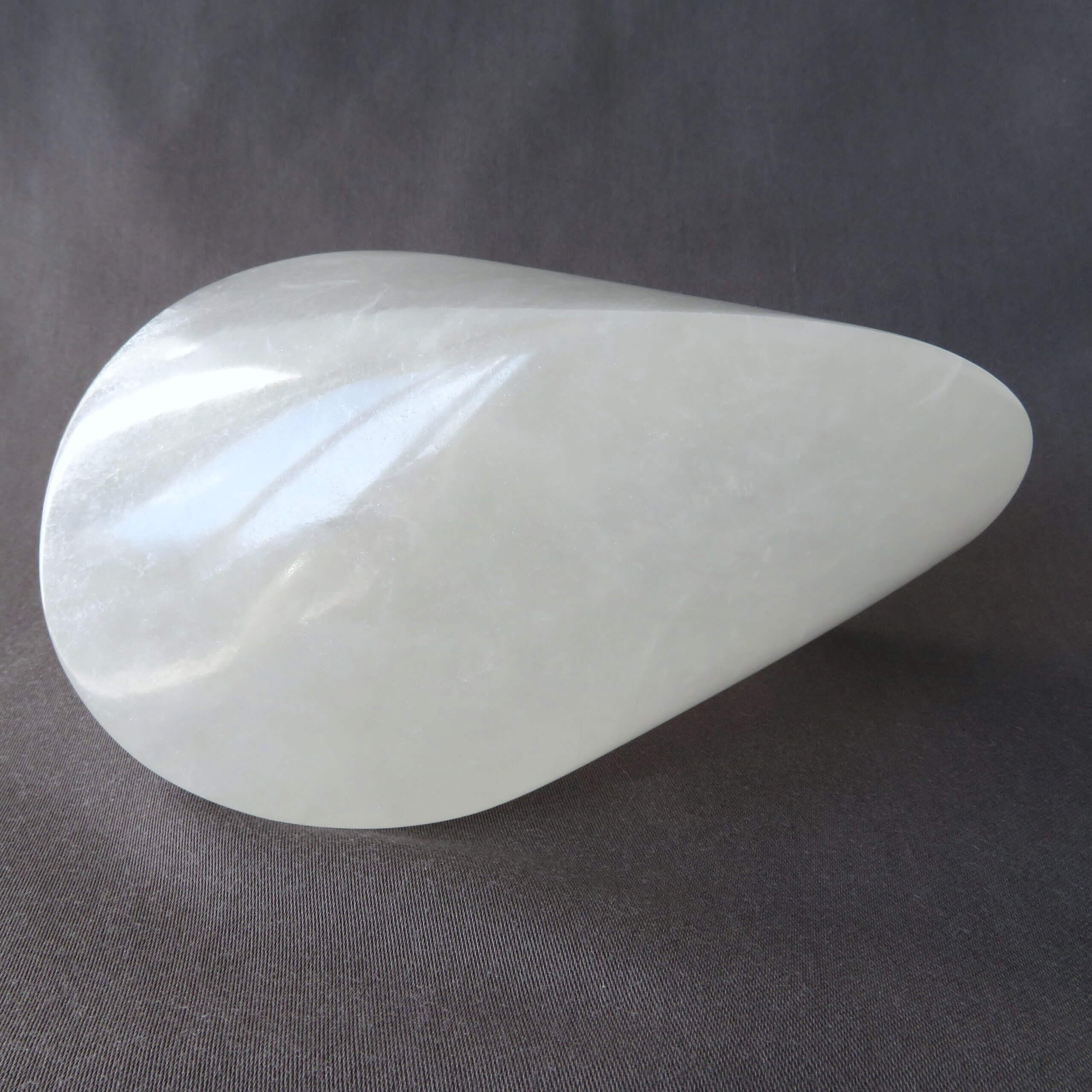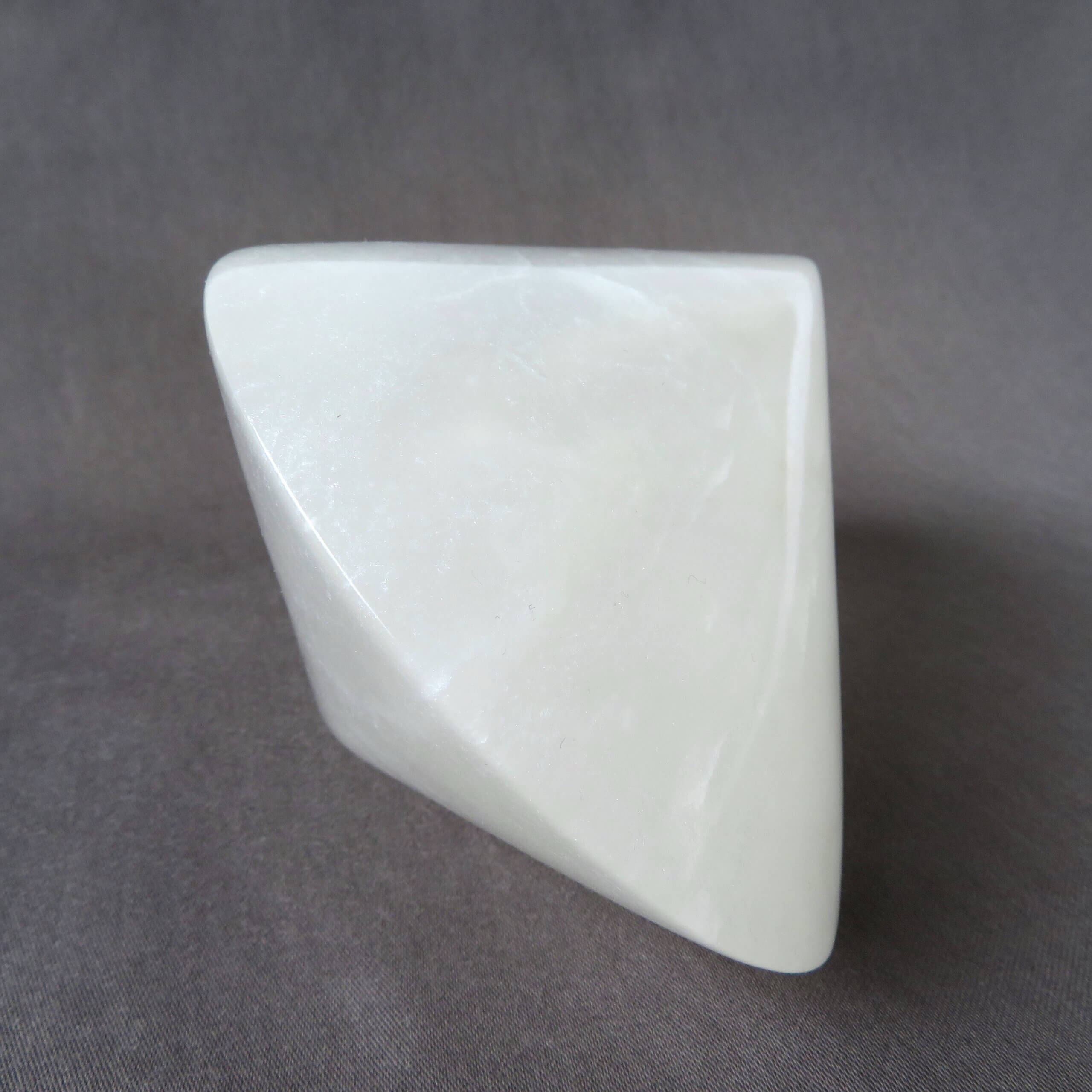 De witte oloïde is vervaardigd uit wit albast en is daarmee licht doorlatend. De oloïde is gepolijst en beschermt met een crème wat de steen een prachtige glans geeft en beschermt tegen verkleuren. Ondanks de bescherming kan albast op ten duur gaan verkleuren. Leg de oloïde dus niet in direct zonlicht.
